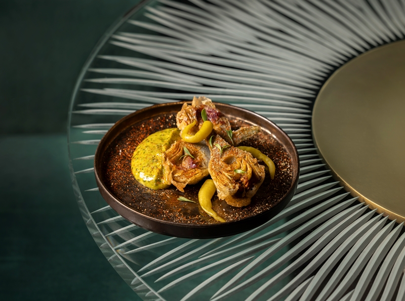 - Confit artichoke with lovage aioli brings softness and herbal lift